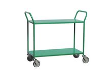 Lackerad bordsvagn i stålrörskonstruktion. 5 olika färger. Höjd övre hyllplan 760 mm, avstånd mellan hyllplan 530 mm. 4 länkhjul 125 mm, med grå gummibana. Mått l x b x h: 1070 x 450 x 940 mm. Kan monteras med hyllkant upp eller ned. Kapacitet 250 kg. Vikt 23 kg. Levereras omonterad = Flatpack.