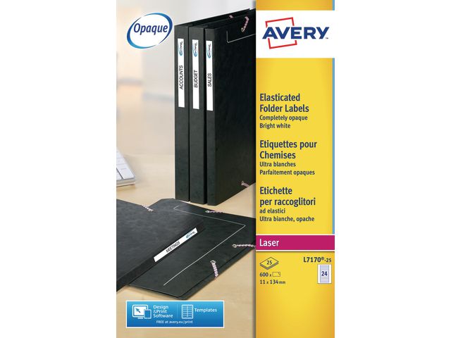 Namnge dina pärmar Namnge dina pärmar! Du vet säkert vilken fantastisk känsla det är när du precis har städat skrivbordet, sorterat högar och satt in papper i pärmar. Den sista lilla finishen är att designa och skriva ut etiketter till alla pärmryggar – det kommer garanterat också att bespara dig mycket tid framöver. Avery L7170-25 etiketter för snoddmappar 134 x 11 mm med 24 etiketter/ark och 600 etiketter/förpackning är också idealiska när du återvänder snoddmappar. De är tillverkade i ett BlockOut™-material som gör dem ogenomskinliga så att gammal text och gamla etiketter döljs till 100 %. Etiketterna är FSC®-certifierade och därmed bara tillverkade av papper från hållbart skogsbruk. Kan skrivas ut med alla sv/v- och färglaserskrivare samt bläckstråleskrivare. JamFree-garantin gör att du inte behöver oroa dig för pappersstopp vid utskriften. Du kan enkelt – och helt gratis – designa och skriva ut dina Avery-produkter med vår mjukvara Avery Design & Print, som innehåller mallar, grafik och designmöjligheter. Läs mer om mjukvaran här: www.avery.se/programvara – Antal: 600/fp