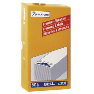 De flesta kontor har en frankeringsmaskin för sin post. Averys frankeringsetiketter 3438, 168 x 44 mm, med en etikett/ark och 500 etiketter/förpackning är professionella frankeringsetiketter på ark för alla vanliga frankeringsmaskiner med vanliga färgrullar och är lämpliga för frankering av kuvert, poströr, paket och andra försändelser. Etiketterna är långa och har plats för t.ex. avsändaradress och logotyp. De är snabbtorkande etiketter som garanterar att frankeringen är klar och tydlig från avsändning till ankomst. De har utmärkt vidhäftningsförmåga på kuvert, poströr, paket och andra försändelser samt levereras i en praktisk ask. – Mått: 168 x 44 mm – Särskilt lämpliga för: Pitney Bowes (PB 6211, E201, E211, E501, E566, E511, E531, E581, E586, DM200, DM300, DM300C, DM400C, DM450C+) och Neopost (Ascom Hasler)