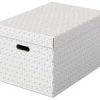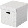 Praktiska lådor med integrerade bärhandtag Modern och rymlig förvaringslåda i FSC-märkt kartong med avtagbart lock perfekt för förvaring hemma eller på kontoret. Set med tre lådor i samma storlek för att användas fristående eller förvaras i hyllor och garderober för att hålla saker som papper, böcker och leksaker organiserade och lätta att hitta. Varje låda har 2 integrerade bärhandtag så att den enkelt kan bäras från rum till rum när det behövs. Tillverkad av stark, 100% återvunnen och 100% återvinningsbar wellpapp som är FSC-certifierad. Geometrisk mönster i dubbla färger som ger stil till din förvaring. Levereras platt förpackad och är snabb och enkel att montera, lådsidorna viks omlott vilket gör lådorna extra stabila. – Mått: 355 x 305 x 510 mm – Färg: grå –