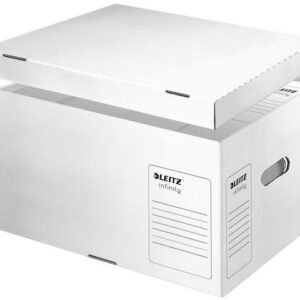 Härifrån till evigheten – Leitz Infinity arkiveringsbox Leitz Infinity, serien för långtidsarkivering, uppfyller den internationella ISO 16245 standarden för långtidsarkivering av dokument. Den FSC certifierade Leitz Infinity serien är tillverkad av korrugerad kartong som är syrafri och av 100% jungfrufiber och rekommenderas till arkiveringsspecialister som nationella arkiv, museum, bibliotek, kyrkor, skolor och privata organisationer Inbyggt lock samt en optimal storlek för arkivhyllor Lådan är idealisk till att förvara A4 dokument och papper Denna låda i storformat passar för 5x 80mm boxar eller 4x100mm Mått: (BxHxD) 350x265x420mm – Rekommenderas för långtidsarkivering av dokument i nationella arkiv, museum, bibliotek och privata organisationer – Tillverkat i syrafri kartong med 100% jungfrufiber enligt ISO 16245 för att skydda dokument – Innovativ design för snabb uppmontering som spar tid och kraft – klar att användas på några få sekunder – Perfekt höjd för hyllarkiv och idealiskt förhållande mellan vikt/ kapacitet för enkel transport – For A4 papers and documents stored in Infinity A4 folders, large size, suitable for 4 x 100 mm boxes or 5 x 80 mm boxes – 100% recyclable, FSC certified