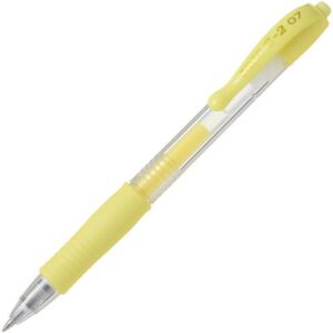 Gelpennan Pilot G2 07 är en snygg penna med smetfri bläcksammansättning som gör det enkelt att skriva. Denna penna glider lätt och har ett mjukt degliknande gelbläck i en avancerad smetfri och vattenfast sammansättning. Pennan har en kula av hårdmetall som behåller sin form och är extremt hållbar. Gelpennan finns också med en användbar fickklämma och den genomskinliga pennkroppen gör att du alltid vet hur mycket bläck som finns kvar. Gelpennan Pilot G2 07 har ett bekvämt gummigrepp och en tunn spets på 0,7 mm. – Klickmekanism – Spetsbredd: 0,7 mm – Linjebredd: 0,32 mm – Textfärg: Gul pastell – Färg pennkropp: Gul transparent