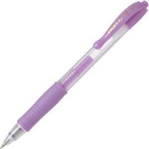 Gelpennan Pilot G2 07 är en snygg penna med smetfri bläcksammansättning som gör det enkelt att skriva. Denna penna glider lätt och har ett mjukt degliknande gelbläck i en avancerad smetfri och vattenfast sammansättning. Pennan har en kula av hårdmetall som behåller sin form och är extremt hållbar. Gelpennan finns också med en användbar fickklämma och den genomskinliga pennkroppen gör att du alltid vet hur mycket bläck som finns kvar. Gelpennan Pilot G2 07 har ett bekvämt gummigrepp och en tunn spets på 0,7 mm. – Klickmekanism – Spetsbredd: 0,7 mm – Linjebredd: 0,32 mm – Textfärg: Violett pastell – Färg pennkropp: Violett transparent