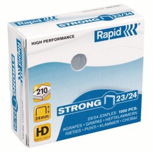 Kraftig, stark häftklammertråd för högsta prestanda med vitt och färgat papper. – För häftning från 150 till 210 ark (80 g/m2) – Varje ask innehåller 1,000 häftklammer – Gul symbol för att förstärka segmentering – STRONG – 24 mm benlängd – Galvaniserad stark tråd för bästa resultat – Skarpa kanter för bästa penetrering