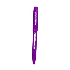 Modernt utformad penna med klickmekanism och gummerad yta från Ballograf. Pennan har raderbart bläck i samma färg som pennkroppen. Bläcket raderas genom att skriften gnuggas med silicontoppen som sitter längst upp på pennan. Silicontoppen är outslitbar. Spetsbredd 0,7mm. Patronen är utbytbar. – Med klickmekanism – Spetsbredd: 0,7mm – Textfärg: Lila – Färg pennkopp: Lila