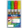 Märkpenna för glas- och spegelytor med rund spets och 2 mm skrivbred. Fungerar även på plast, blackboards, porslin och andra blanka ej porösa ytor. Ger ett täckande kritliknande resultat som syns väl på långt håll. Kan torkas bort med torr trasa, har färgen suttit en längre tid avlägsas den enkelt med fuktig trasa. Aluminiumhylsa. Vattenbaserat pigmenttusch utan Xylen. 4-pack med svart, vit, blå, lila färg. – Vattenbaserat bläck – Med huv – Rund spets – Linjebredd: 2,0 mm – Textfärg: Svart/Vit/Blå/Lila