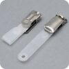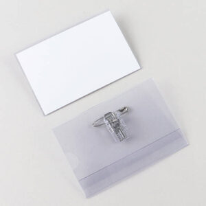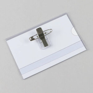 Plastficka i visitkortsstorlek liggande med krokodilklämma och säkerhetsnål.