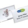 Med namnbrickan från DURABLE med indragbar jojo tar du enkelt fram ditt passerkort när du behöver dra eller läsa det. Namnbrickan ger ett professionellt intryck och lämpar sig för användning vid utbildningar, konferenser och på arbetsplatser. Den är tillverkad i tålig PVC för långvarig användning. Namnbrickan levereras med tomma insticksetiketter som kan anpassas efter dina krav. Jojon säkrar namnbrickan och skyddar etiketten. Tillverkad av PVC. – Namnskylt med indragbar jojo – Hållbar konstruktion i PVC – Genomskinlig design – Jojon sträcker sig upp till 85 cm – Tomma instick ingår – Mått: 60 x 90 mm