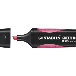 Markera viktig information med den miljövänliga överstrykningspennan STABILO® GREEN BOSS® som är tillverkad av 83 % återvunnen plast och har en Anti-Dry-Out-teknik. Överstrykningspennan STABILO® GREEN BOSS® är tillverkad av 83 % återvunnen plast och har ett tillförlitligt vattenbaserat bläck med Anti-Dry-Out-teknik så att korken kan vara av under 4 timmar utan att den torkar ut. Den kan användas på nästan alla typer av papper. Den har en mejselformad spets som ger dubbla linjebredder på 2 respektive 5 mm samt en bekväm greppzon så att du kan använda den i många olika sammanhang, till exempel för att skriva, stryka under eller markera. Överstrykningspennorna från STABILO® GREEN passar perfekt för miljömedvetna studenter och yrkesverksamma som måste läsa och markera viktig information i texter. Överstrykningspennan finns i ett antal olika attraktiva färger och har den klassiska BOSS®-formen med en platt pennkropp som inte rullar iväg. Tack vare den billiga bläckpåfyllningen kan du dessutom återanvända överstrykningspennan istället för att kasta den. – Överstrykningspennan är tillverkad i 83 % återvunnen plast – Ett miljövänligt val – STABILO® Anti-Dry-Out-teknik – Kan vara utan kork i upp till 4 timmar – Mejselformad spets med dubbla linjebredder på 2 respektive 5 mm – Kan markera text och innehåll på upp ca 375 m – Klassisk design med platt pennkropp – Vattenbaserat bläck – Färg: Rosa