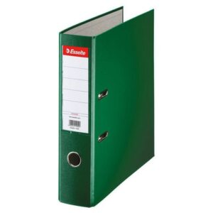 Pärm i kartong belagd med färgad PP-film på utsidan och papper inuti. Den här pärmen har ett metallförstärkt tumhål och metallkanter för säker förvaring och enkel hantering. Levereras med utbytbar och vändbar etikett. – Europahålning – Utbytbar och vändbar ryggetikett – Ryggbredd: 75 mm – Färg: Grön