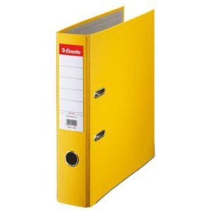 Pärm i kartong belagd med färgad PP-film på utsidan och papper inuti. Den här pärmen har ett metallförstärkt tumhål och metallkanter för säker förvaring och enkel hantering. Levereras med utbytbar och vändbar etikett. – Europahålning – Utbytbar och vändbar ryggetikett – Ryggbredd: 75 mm – Färg: Gul