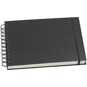 Skissblock Grieg. Spiralbunden med hårt omslag, och med gummibandsförsluting i svart som håller innehållet på plats. A5 liggande, 150g syrafritt samt perforerat papper, 60 blad, olinjerat, svart.