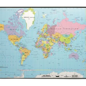 Skydda ditt skrivbord med stil med det här skrivbordsunderlägget från Durable. Det här skrivbordsunderlägget med en världskarta i ljust tryck har en halkfri undersida och en något fjädrande översida. Ytan går mycket lätt att rengöra genom att torka med en fuktig trasa. Tillverkad av PVC. – Skrivbordsunderlägg – Med tryck – Mått: 40 x 53 cm