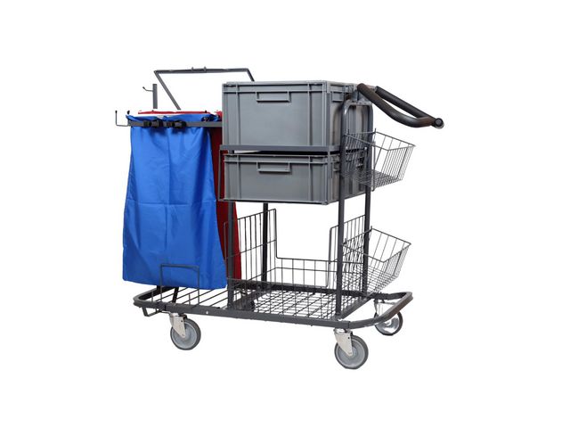 Stor och ergonomisk vagn med generösa utrymmen för utrustning. Komplett med 3st korgar, tröskelkrypare, sopsetshållare, 2st 20l backar, 2st 15l backar, 2st tvättsäckar, 2st tvättnät. Vagnen är av hög kvalitet, robust och ergonomiskt utformad för moderna städmetoder. Systemvagnen har plats för stora förvaringsbackar och mycket utrustning. Vagnen är anpassningsbar för de flesta städområden. S2-Systemvagn Stor har en tröskelkrypare som är ergonomisk och lätt att använda. Handtaget är justerbart i två lägen. Med de lättkörda tysta hjulen så styr du vagnen ergonomiskt och lätt i ditt dagliga arbete. Flaskhållare (lev.nr. 62600542) och skrivplatta (lev.nr. 62600543) är tillbehör och köps separat. – Ergonomisk – Unik tröskelkrypare – Lättkörda designade hjul – Mått: L 1000 mm, B 615 mm, H 1090 mm