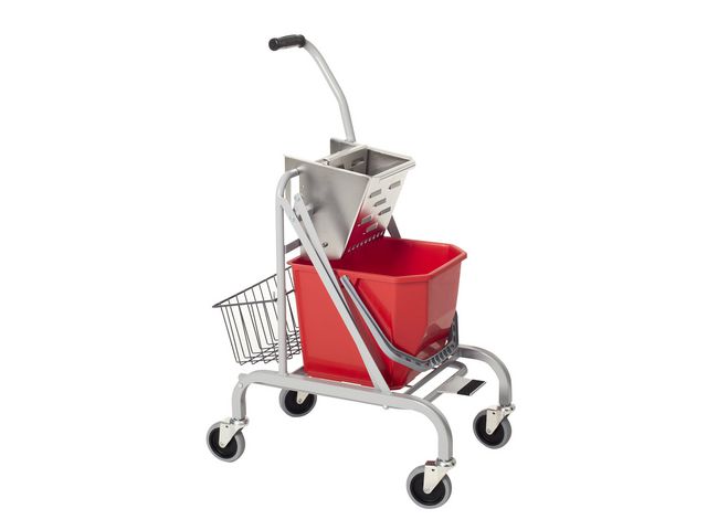Den perfekta lilla svabbvagnen för svårstädade ytor. En liten svabbvagn med hand och fotpress 15 liters hink och rostfri press. Utrustad med 1 st korg. Låsbart hjul. – Rostfri press – Låsbart hjul – Liten – Mått: L 550 mm, B 400 mm, H 1070 mm – Tillverkad i Sverige