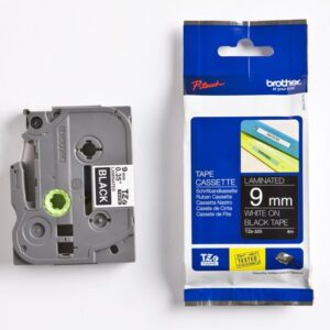 Brothers laminerade TZe-325-tejp är idealisk för användning i vardagen med en rad Brother P-Touch-etikettskrivare för blanka svarta etiketter med vitt tryck. Märkningstejpen är kompatibel med Brother-etikettskrivare och använder direkt termisk teknik. Ladda och mata ut rullar enkelt när du behöver byta storlekar och väl på plats justeras etiketterna automatiskt. Dessa skimrande etiketter kan användas inomhus och utomhus under normala förhållanden, och passar bäst för plana och jämna ytor. – Utformade för inom- och utomhusbruk – Storlek (i mm): 9 mm x 8 m – Färg: Vitt på svart – Kompatibla med: P-Touch PT-1000, 1005, 1010, 1080, 1090, 1100, 1170, 1180, 1190, 1230, 1250, 1260, 1280, 1290, 1400, 1600, 1650, 18, 1830, 1850, 1880, 1950, 1960, 2030, 2100, 2110, 2420, 2430, 2460, 2470, 2480, 2700, 2710, 2730, 7100, 7500, 7600, 900, 9500, 9700, 9800, D200, E300, PT-GL-100, PT-H100, H105, H300