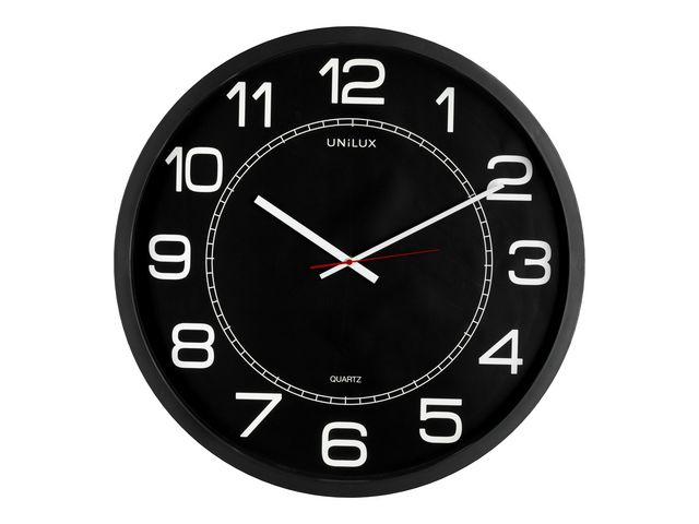 Unilux MEGA är en stor klocka på 57,5 cm i diameter. Glasfront som skyddar mot damm och smuts. Läsbar från 180 meter tack vare de stora vita siffrorna. – Batteri 1 st. 1,5V AA Inkl.